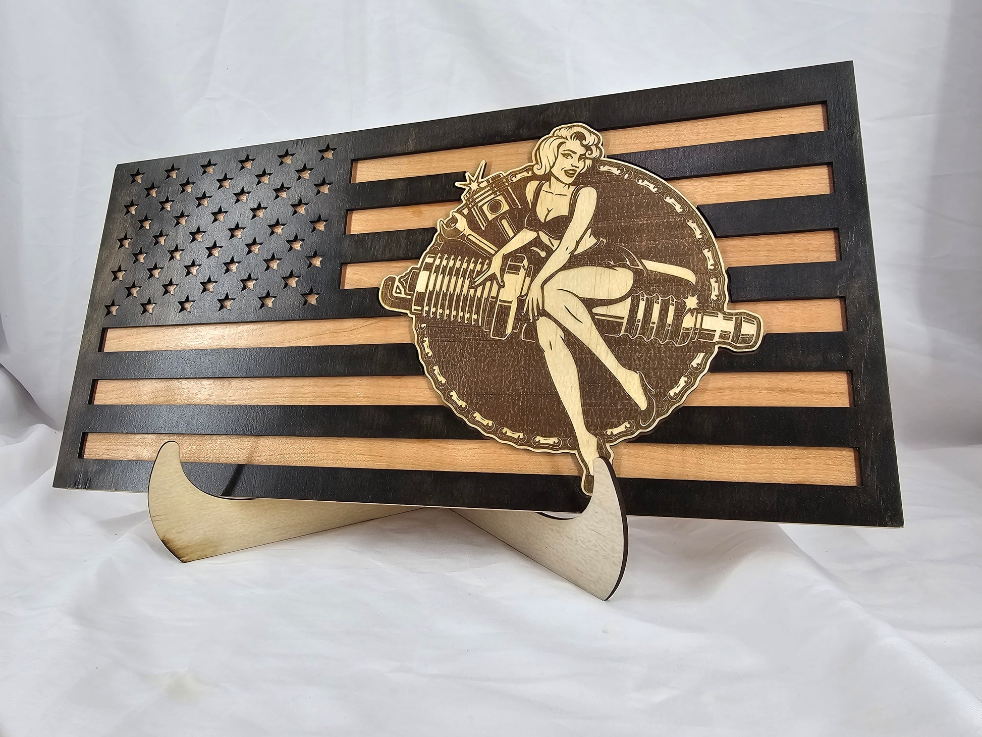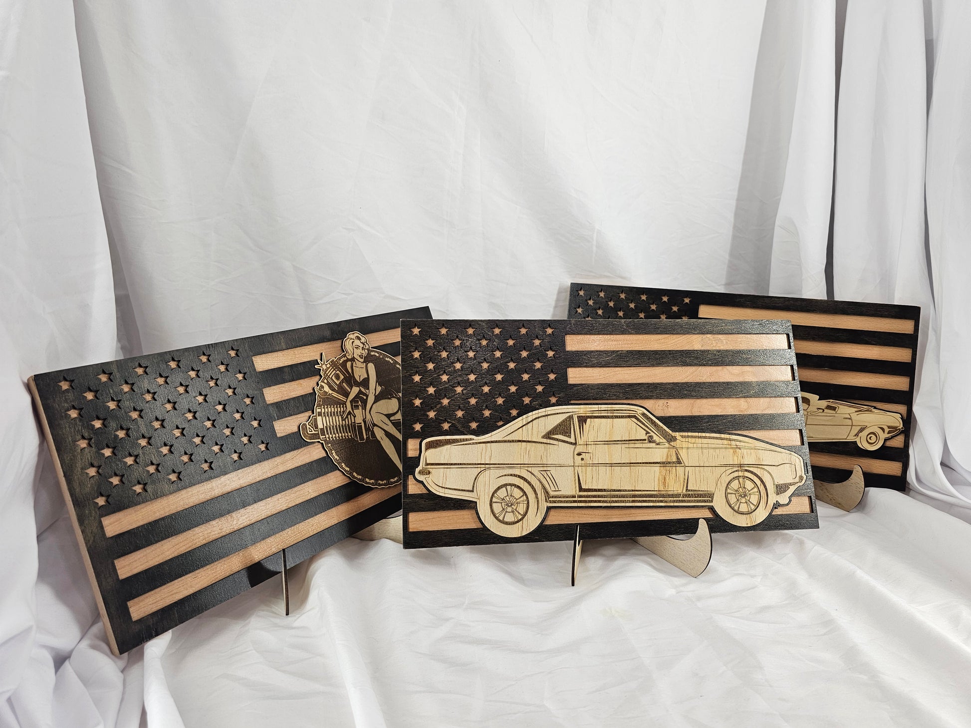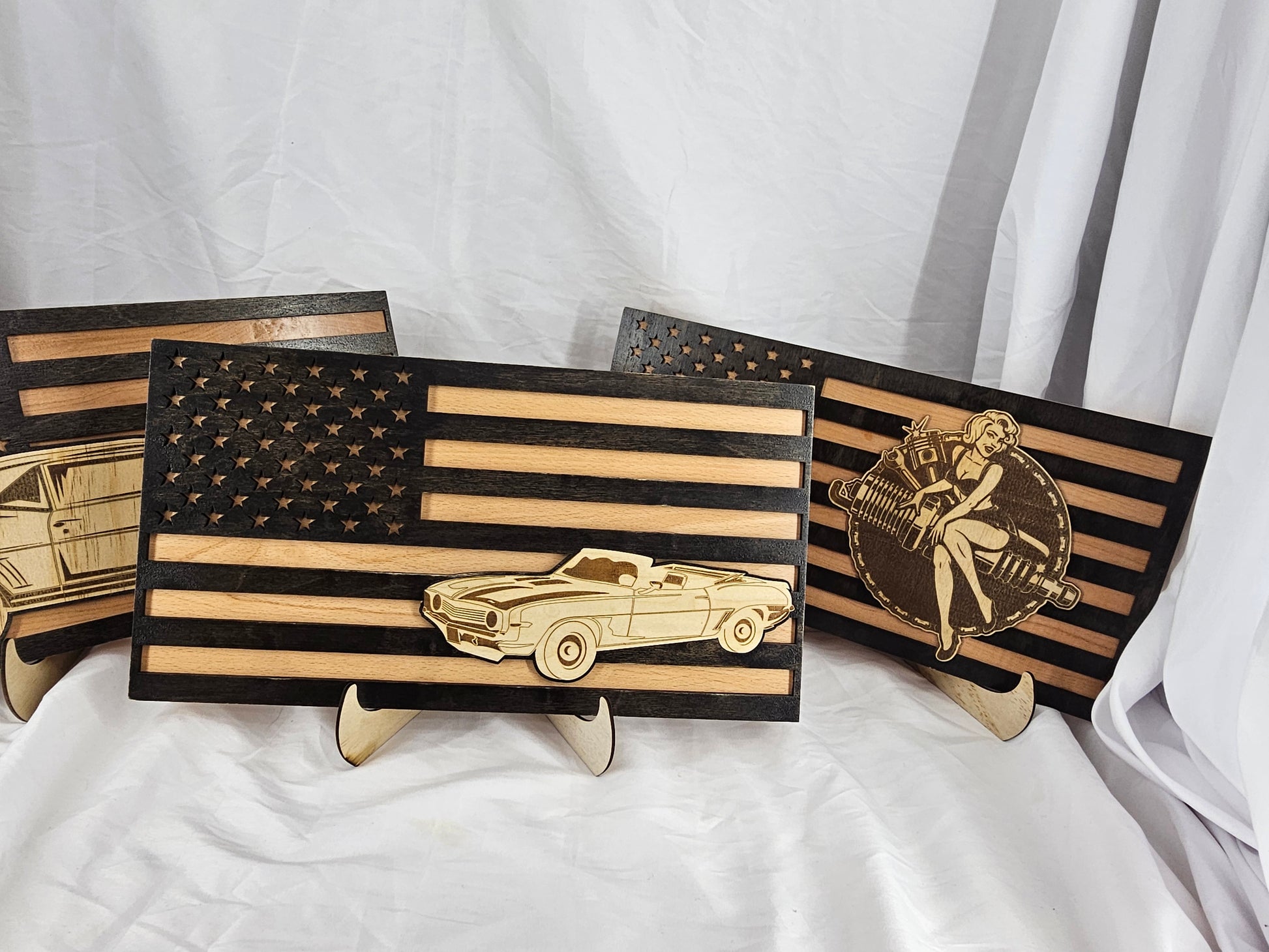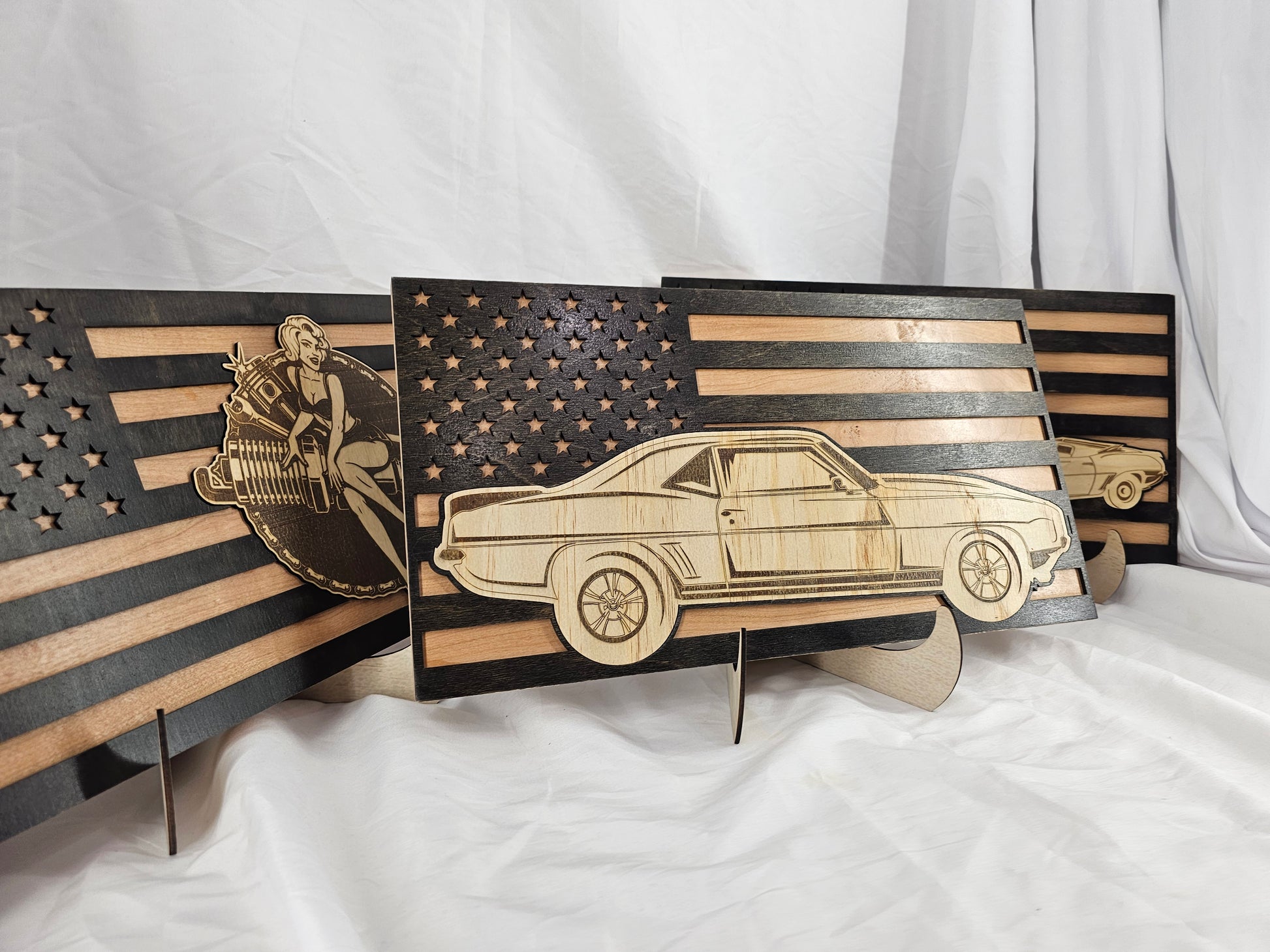 Celebrate your love for American classics with our handcrafted American Flag Car Signs, designed for car enthusiasts, collectors, and anyone who appreciates timeless craftsmanship. Each sign is a one-of-a-kind blend of patriotism and artistry, merging the bold design of the American flag with laser-engraved detail of iconic cars and retro pin-up art.