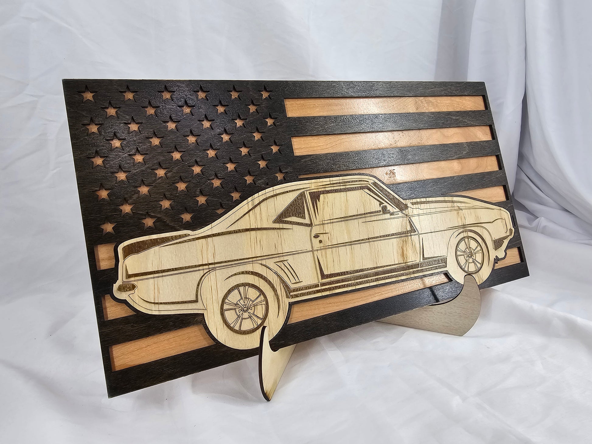 These pieces are carefully laser-engraved and cut from high-quality hardwood, then hand-finished to enhance the natural grain and durability of the wood. The precision carving brings each detail to life—from the stars and stripes to the fine lines of classic muscle cars—making these signs not just décor, but a statement piece.