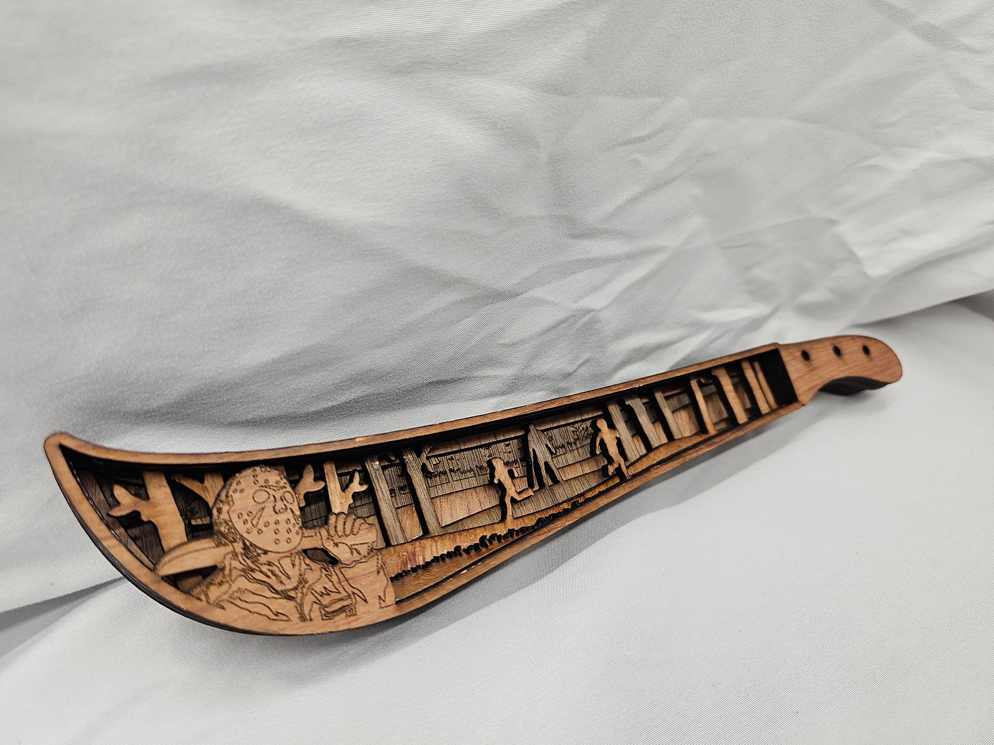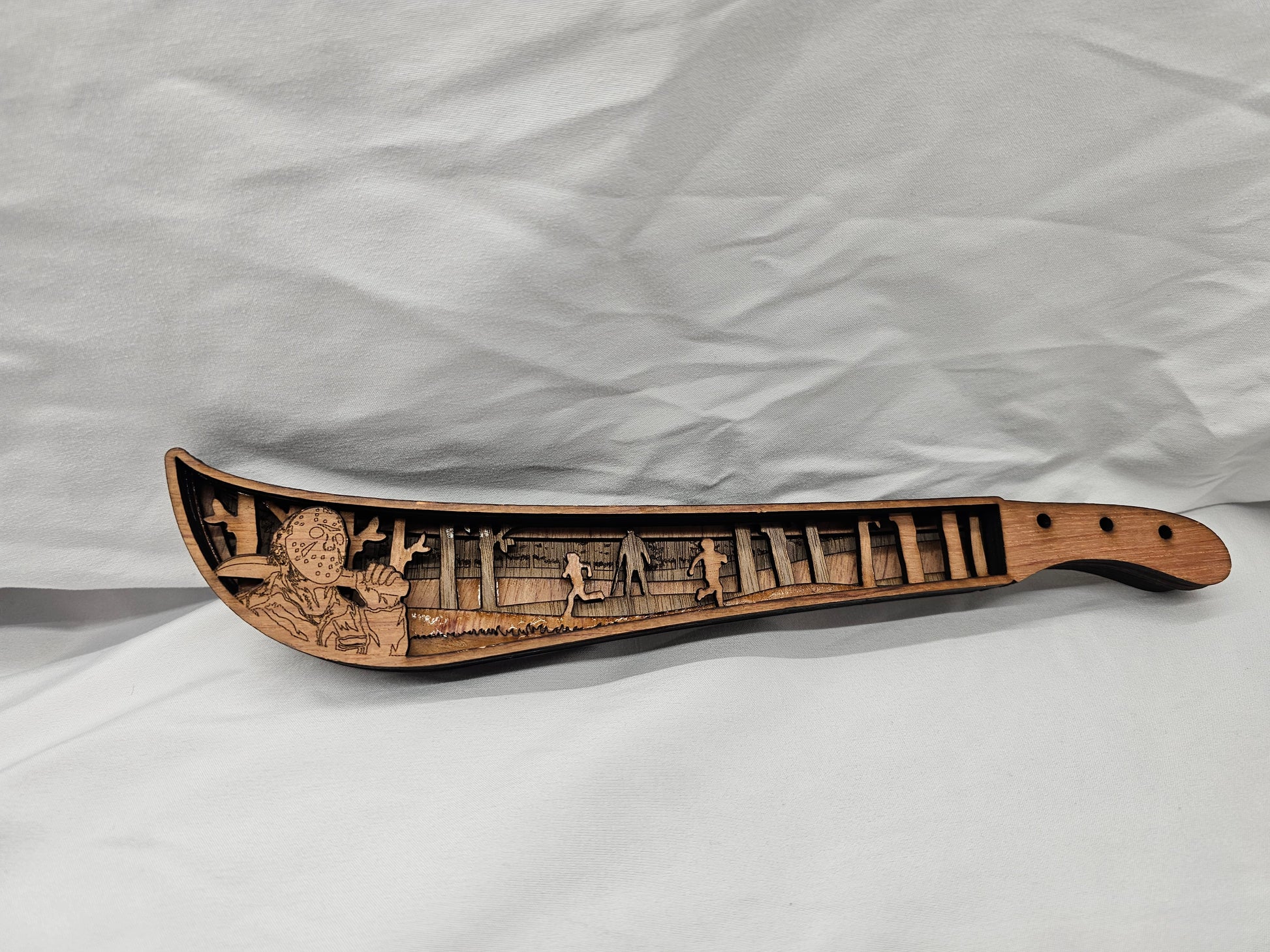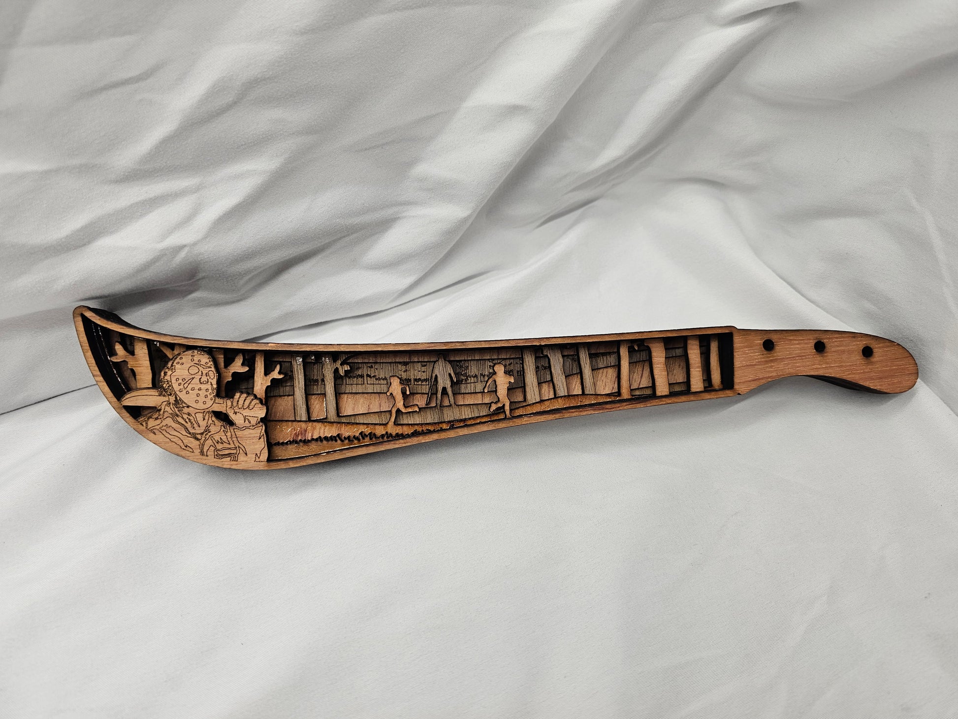 Bring the chills of Camp Crystal Lake right into your home with this handcrafted wooden machete wall art. Featuring an intricately engraved design of Jason Voorhees and haunting scenes from the legendary Friday the 13th films, this piece captures the essence of spooky nostalgia.