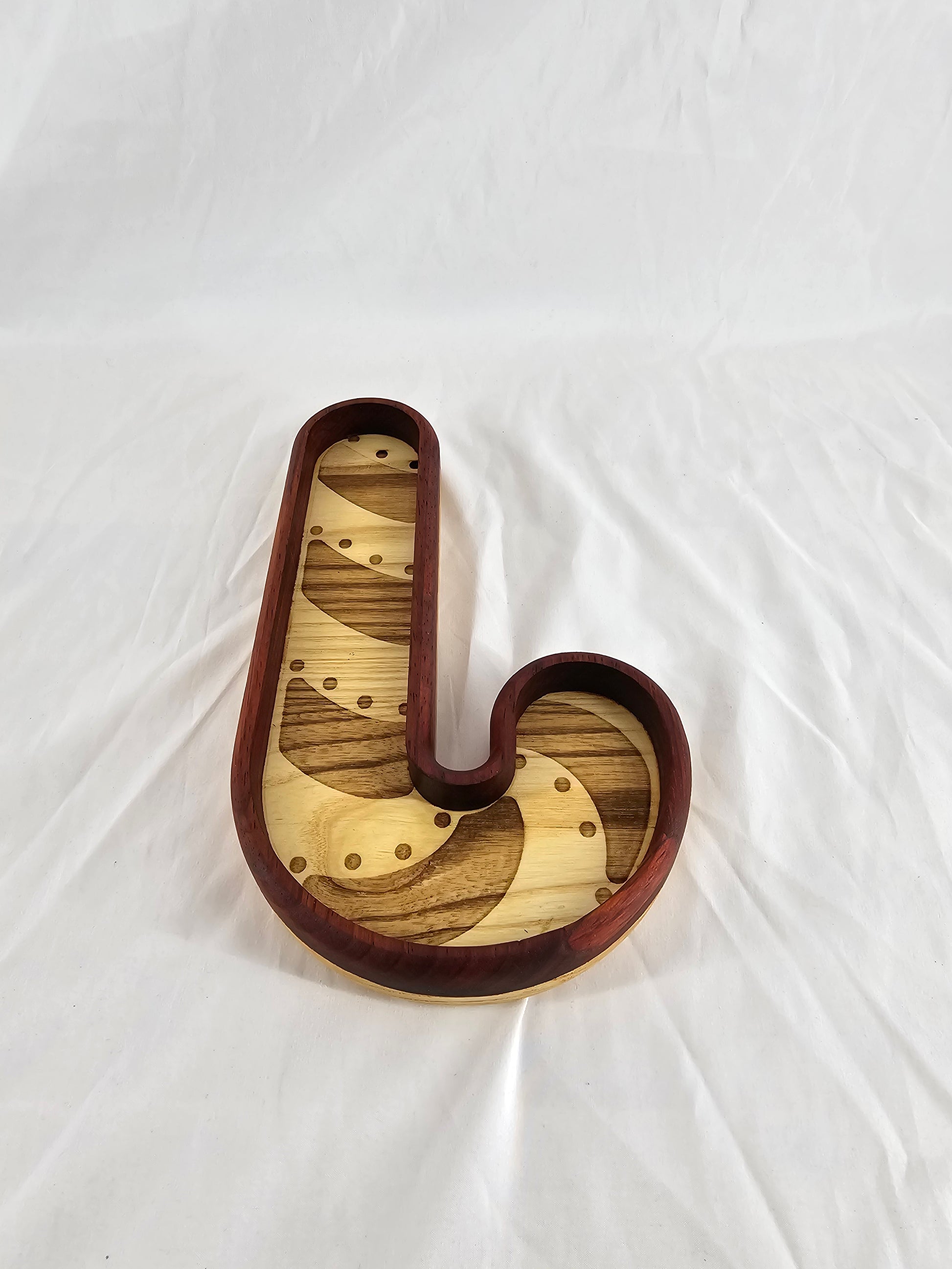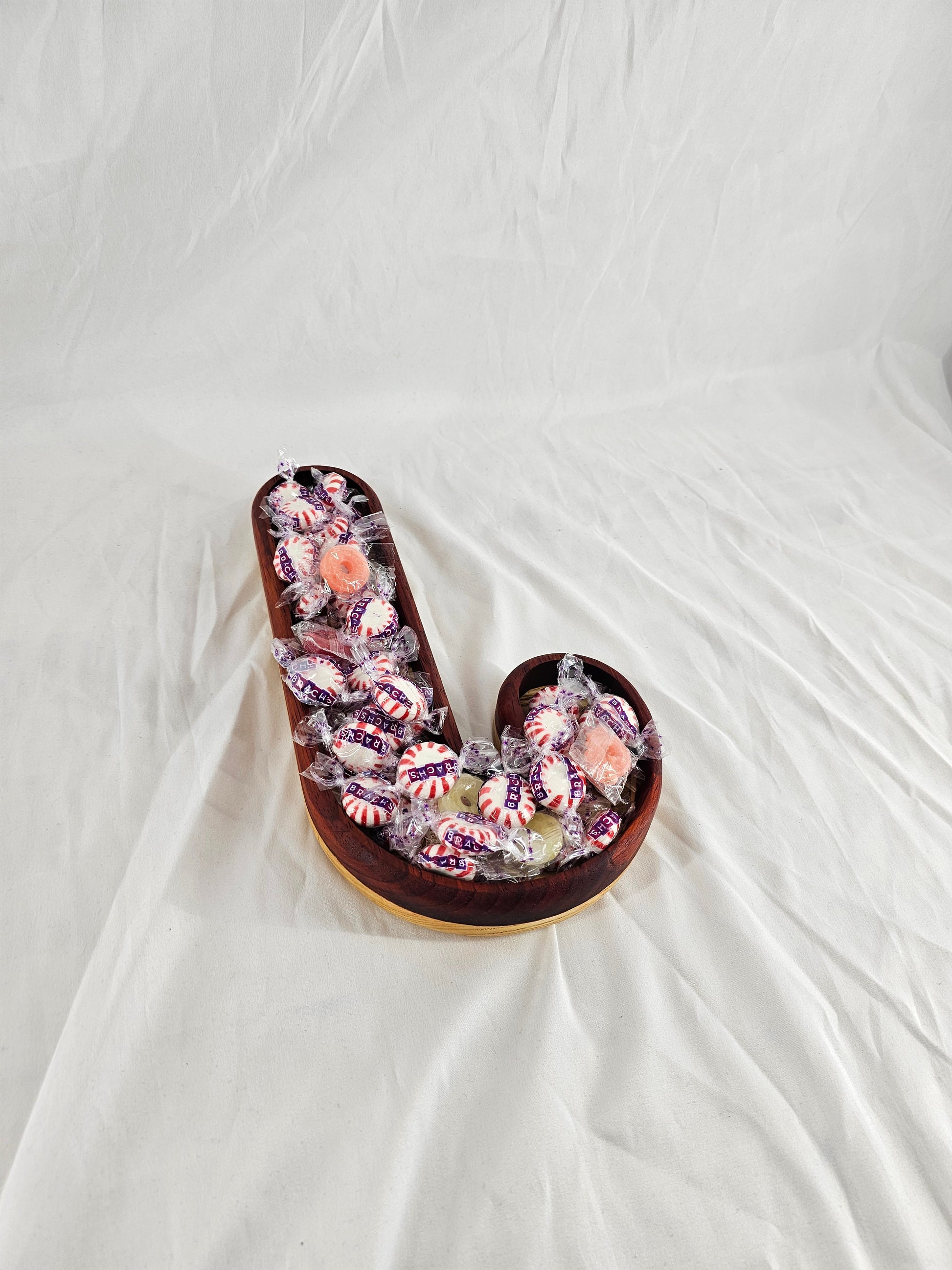 Shaped like a festive candy cane, this dish is perfect for holding holiday treats, small trinkets, or as a delightful decorative centerpiece for your home. Its unique blend of natural wood tones adds warmth and charm, making it a standout piece in any seasonal display.