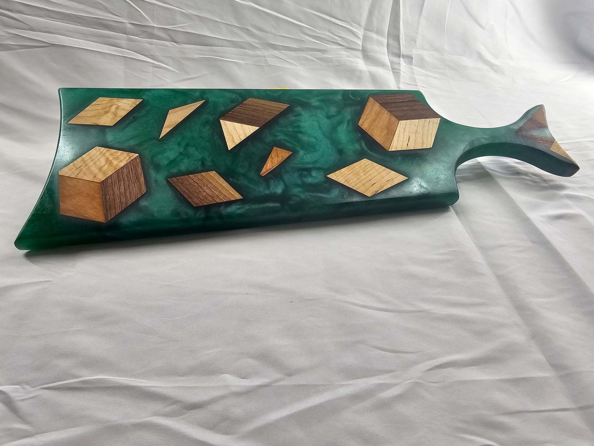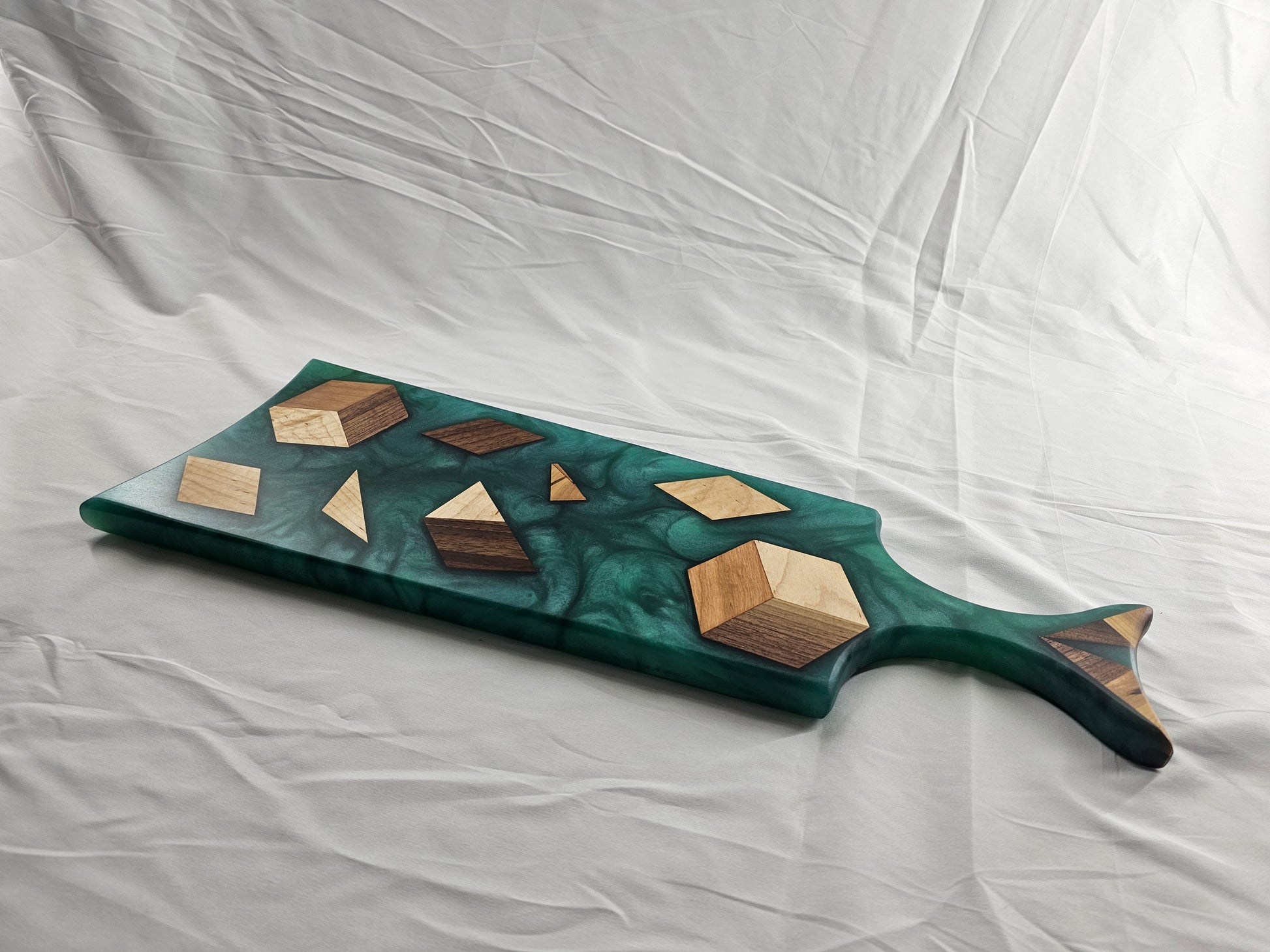 Crafted with meticulous attention to detail, this board showcases a mesmerizing display of maple, walnut, and cherry cubes encased in vibrant green-tinted epoxy. Each cube is carefully selected for its distinct grain pattern and natural beauty, creating a harmonious blend of colors and textures that will mesmerize any observer.