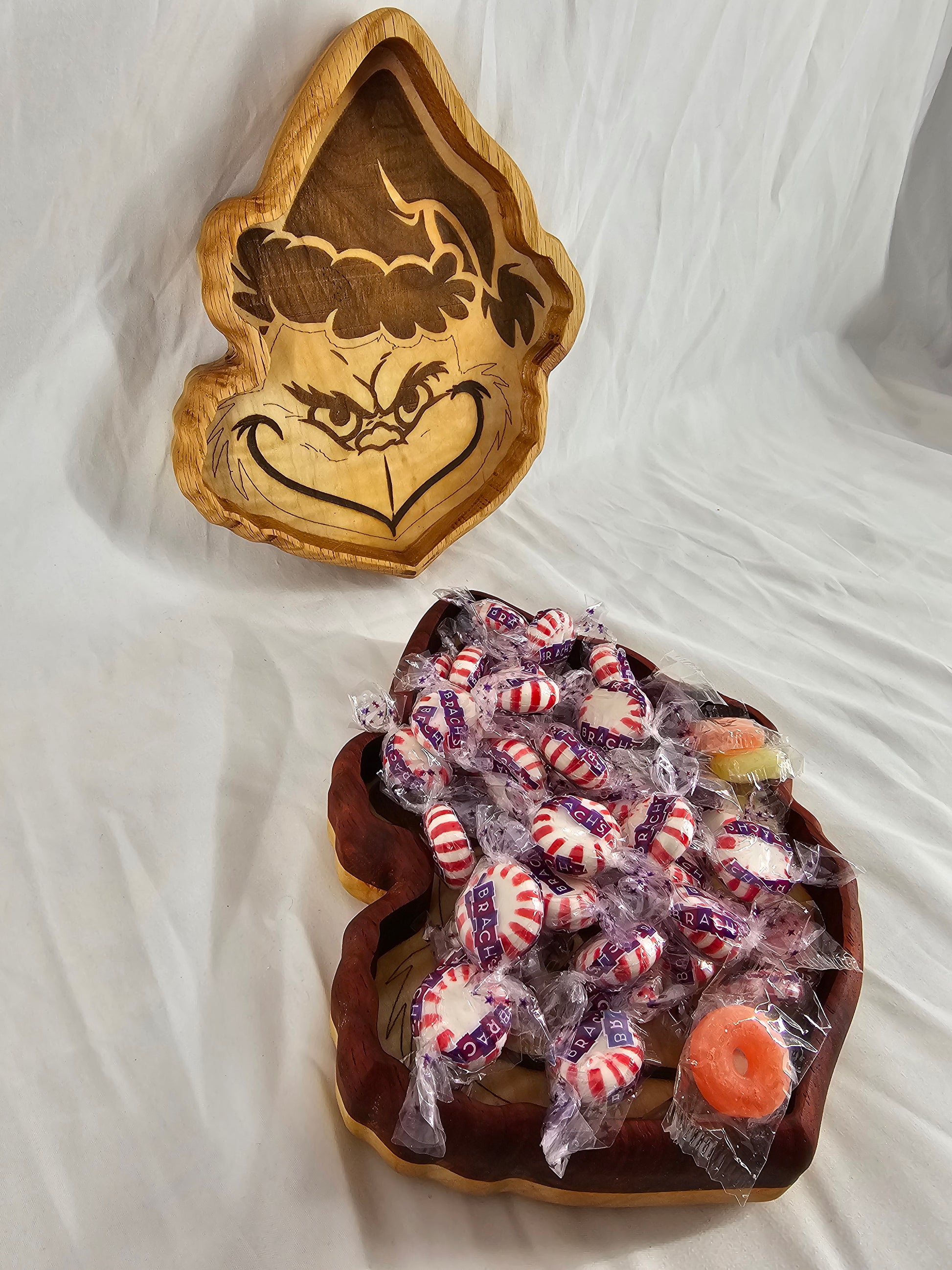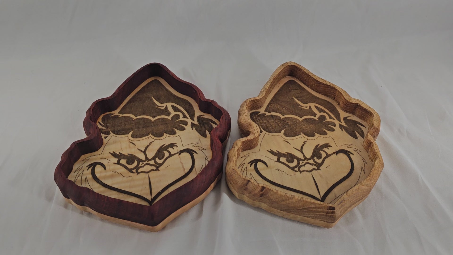 Bring a touch of holiday mischief to your home with our Handcrafted Wooden Grinch Candy Dish! Inspired by the iconic character, this whimsical dish is carefully crafted from a striking blend of white oak, ash, padauk, and purpleheart woods. The unique combination of these rich, natural materials creates vibrant contrasts that make this dish a true conversation piece.