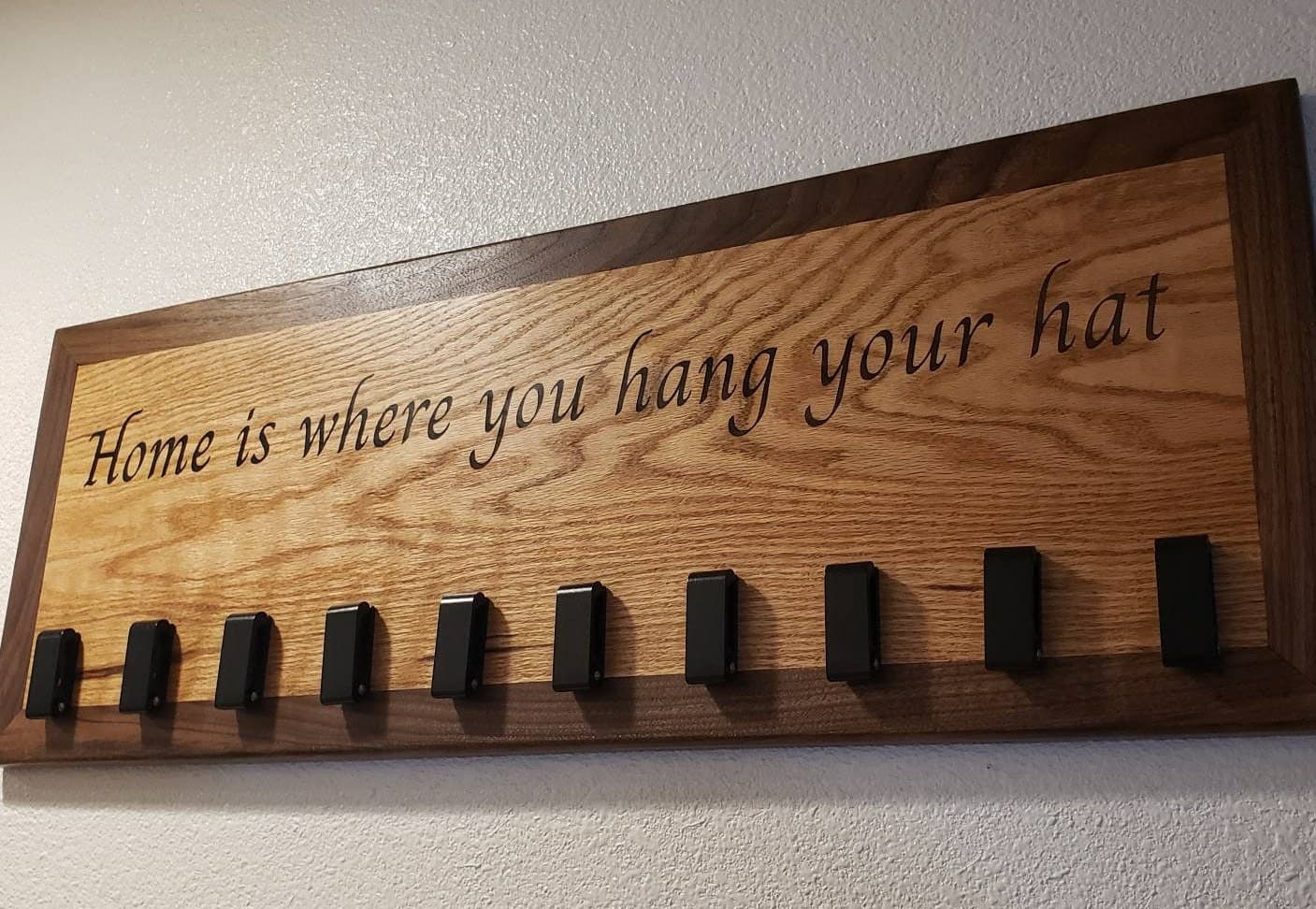 These beautiful Hat hangers are constructed from a Oak ply that has been framed in by Walnut strips. The walnut strips are Mitered on each corner. We added a roundover to all the edges to give the hanger a lighter touch.