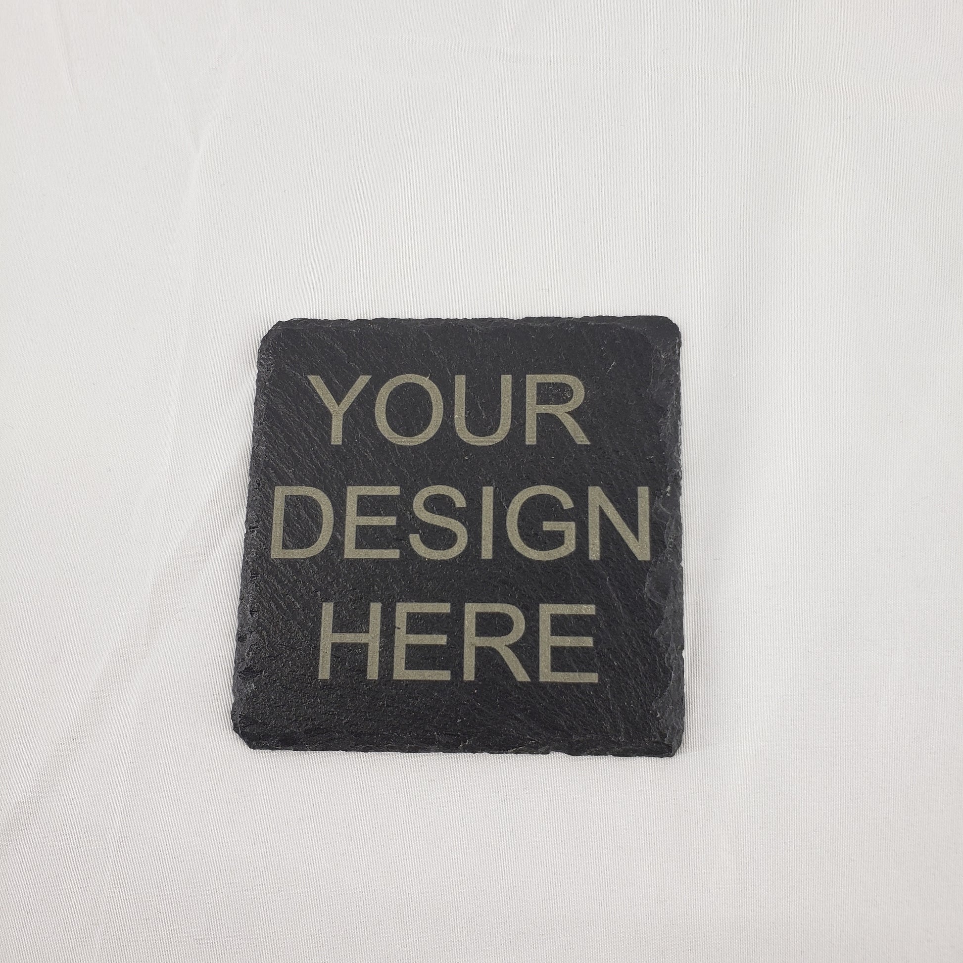 Our slate coaster set is the perfect addition to any household. These coasters will make a perfect wedding gift, housewarming gift, birthday or Christmas present. The gift giving options are basically endless. Slate coasters are a natural product. Each coaster will have different edge contours and variations in surface thickness. Each coaster has round padded feet to protect your table from the coaster. We laser engrave each coaster ourselves. Simply choose the design you would like engraved on the coaster and I will handle the rest.