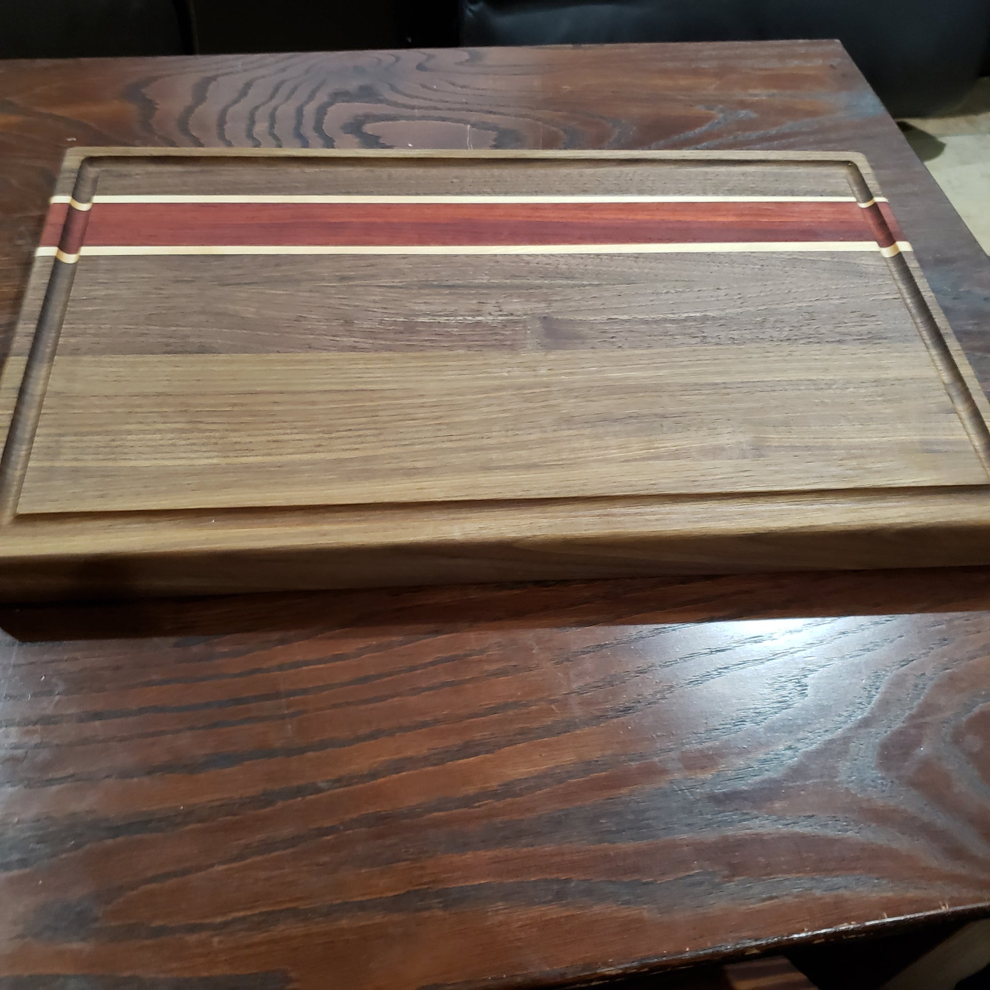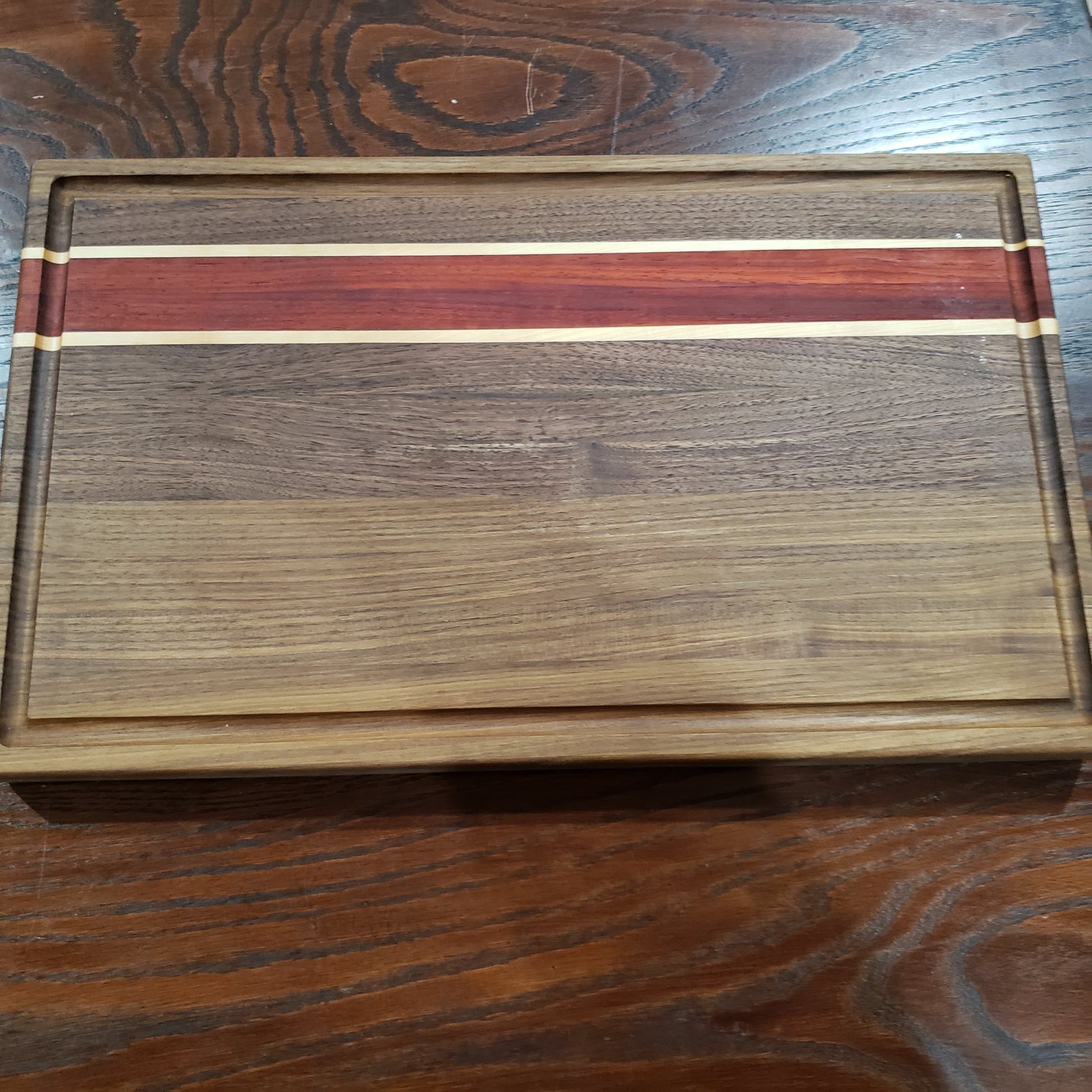 Measuring approximately 21"x12.5"x1.5", our Wood Serving Board offers a generous surface area to showcase your culinary creations. The combination of rich, dark Walnut, vibrant Padauk, and the timeless charm of Maple creates a stunning mosaic of colors and grains, making each board a unique and captivating centerpiece.