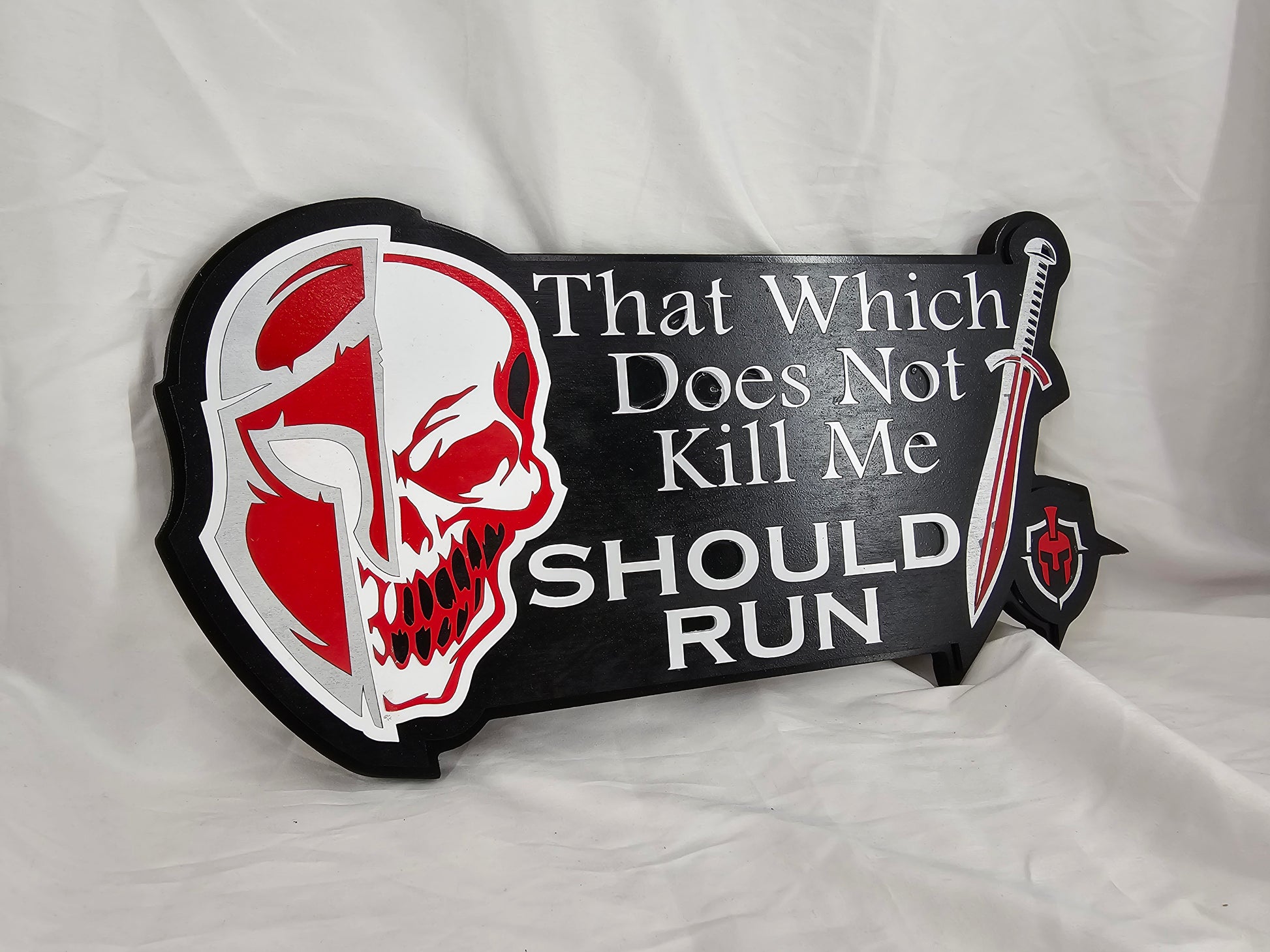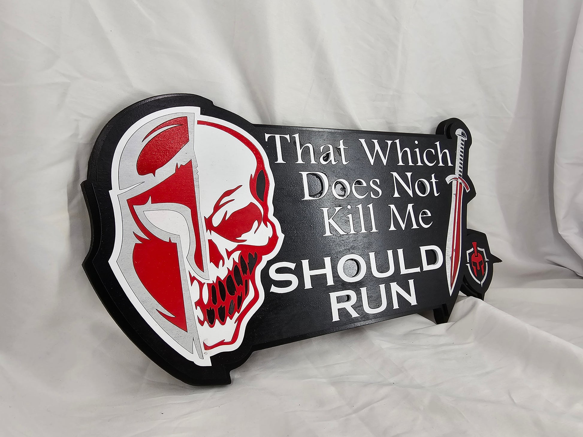 Make a bold statement with this handcrafted wooden wall sign featuring a striking skull-and-helmet design paired with the powerful words: “That Which Does Not Kill Me Should Run.” 🛡️⚔️